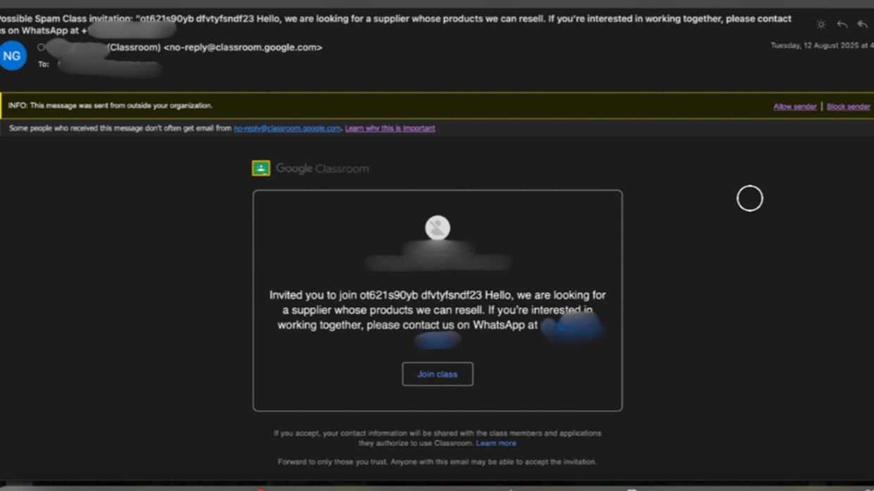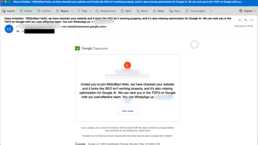 Eine neue Art des Phishings breitet sich aus. Sie setzt dabei auf bewährte Marken, unaufgeklärte Mitarbeitende und ungeschützte Kanäle.Laut Google nutzen 40 Millionen Lehrer und Schüler weltweit Google Classroom, um Leistungsnachweise, Schulaufgaben und Lehrmaterial bereitzustellen. Da die Software weit verbreitet ist, wird sie attraktiv für Cyberkriminelle. Eine immer noch aktive, weltweite auftretende Kampagne hat der Cyber-Sicherheitslösungs-Anbieter Check Point aufgedeckt: 115.000 Phishing-E-Mails wurden an 13.500 Organisationen aus verschiedenen Branchen auf allen Kontinenten verschickt und das binnen nur einer Woche.Die Angreifer nutzen dabei das Vertrauen in die Plattform und den bekannten Markennamen aus, um gefälschte Einladungen mit gefälschten kommerziellen Angeboten zu versenden. Diese reichen von Verkaufsangeboten bis hin zu SEO-Dienstleistungen.Jede dieser E-Mails fordert die Empfänger auf, die Betrüger über eine Messenger-Telefonnummer zu kontaktieren. Das ist eine Taktik, die häufig mit Betrugsmaschen verbunden ist.