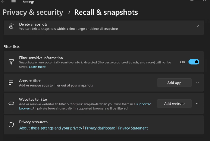 Susan Bradley / CSOSecurity teams should consider setting policies to block Recall’s installation in cases where its use doesn’t meet your privacy and security policies. In addition, you should consider the impact that consultants and independent or temporary employees may have when accessing your resources. The feature is not without its criticisms. Early versions of Recall were not encrypted. Moreover, snapshots could be accessed by other users on the system and were merely protected with NTLM permissions.Guidance is provided by Microsoft on how to best manage the service. As the company notes, “By default, Recall is removed on commercially managed devices. If you want to allow Recall to be available for users in your organization and allow them to choose to save snapshots, you need to configure both the Allow Recall to be enabled and Turn off saving snapshots for Recall policies.”